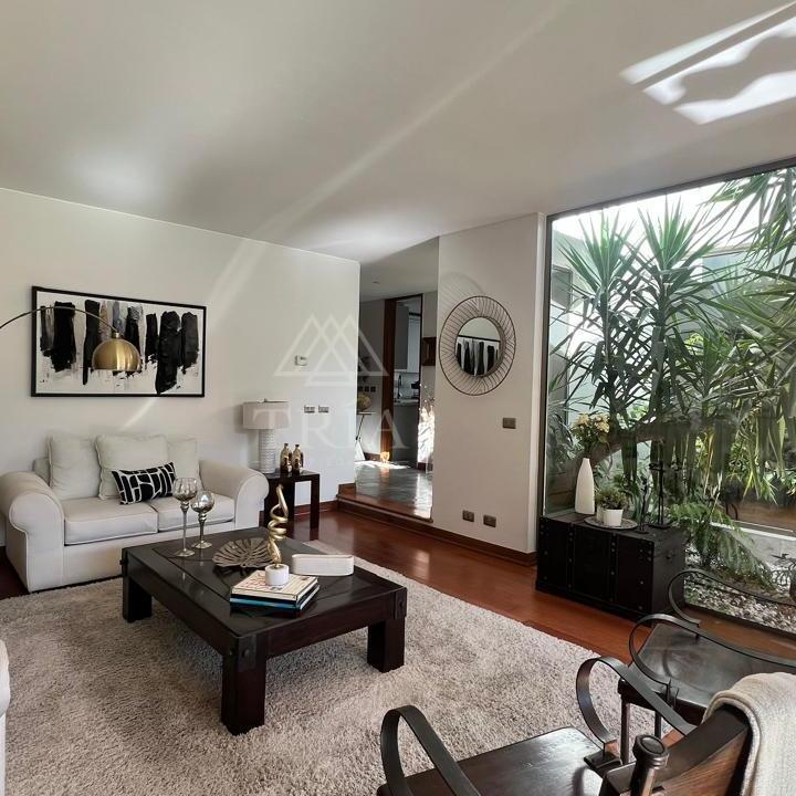 El área social cuenta con living y comedor separados con piso de madera, conectados a una terraza techada que se integra de manera natural con el jardín.
